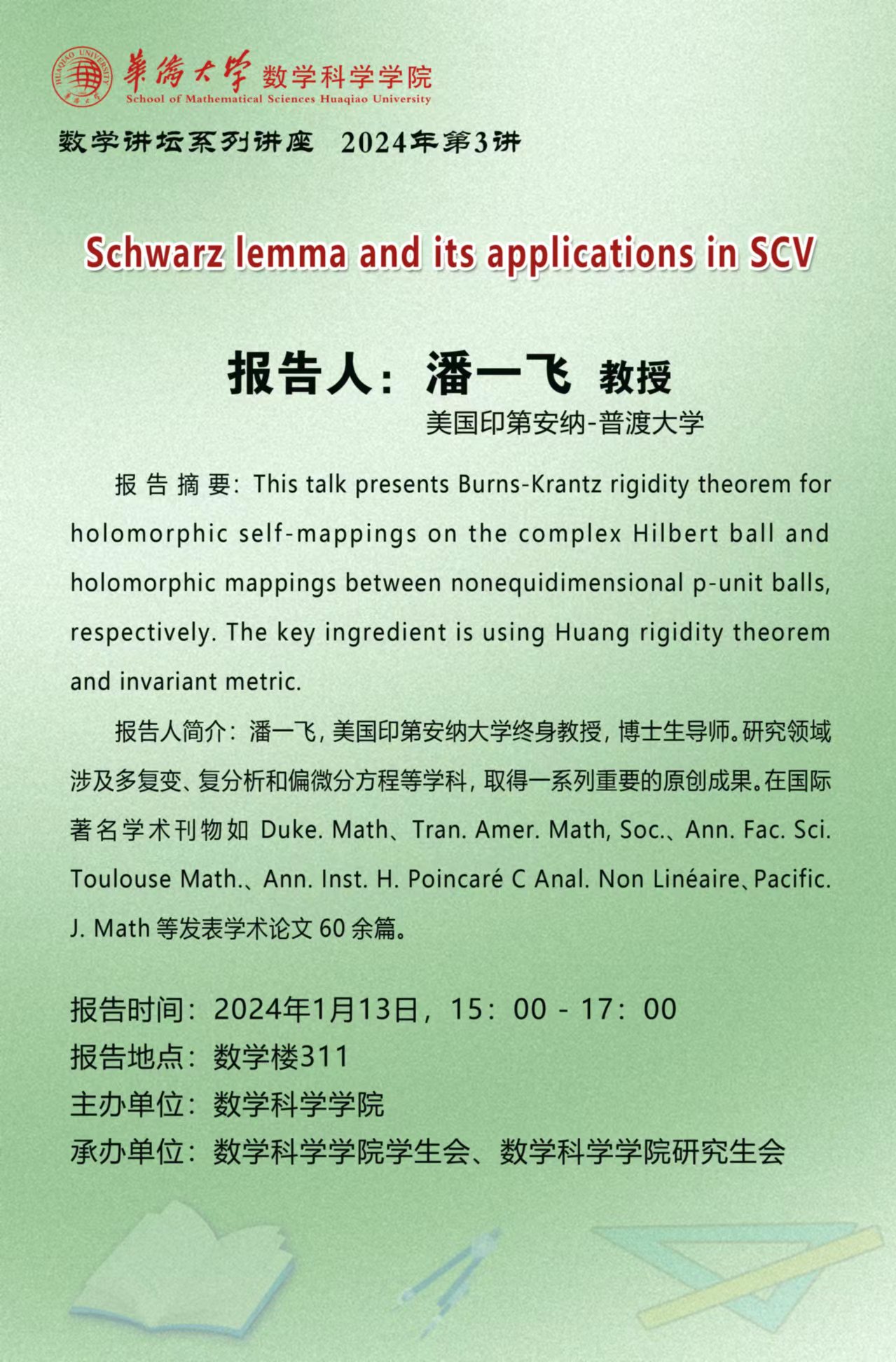 上一条:Hopf lemma applying to PDE--潘一飞 美国印第安纳-普渡大学 下一条:拟共形调和映射中的 Riesz 共轭定理 —刘劲松 研究员