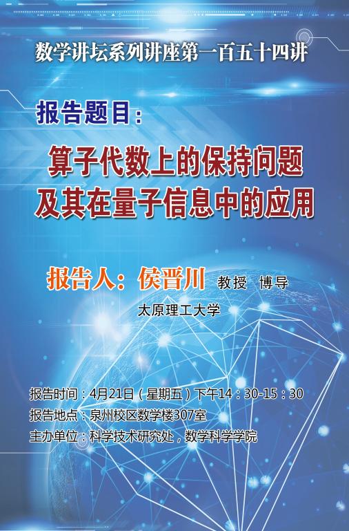 上一条:纠缠witness的构造及刻画----山西大学齐霄霏副教授 下一条:Highest weight vectors in certain tensor modules----国家杰出青年基金获得者芮和兵教授