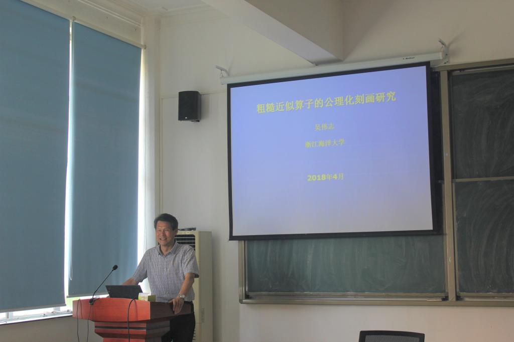 4月26日下午,受我院邀请,浙江海洋大学数理与信息学院院长吴伟志教授在数学楼307室开展题为粗糙近似算子的公理化刻画研究的学术讲座。我院副院长黄建新出席并主持了本次讲座,参加讲座的还有我院相关专业师生。