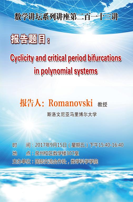 上一条:Dynamics analysis of a pest management prey-predator model by means of interval state monitoring and control---澳大利亚斯威本科技大学张同华副教授 下一条:Some results on integrability and linearizability of p:-q resonant vector fields----斯洛文尼亚马里博尔大学Romanovski教授
