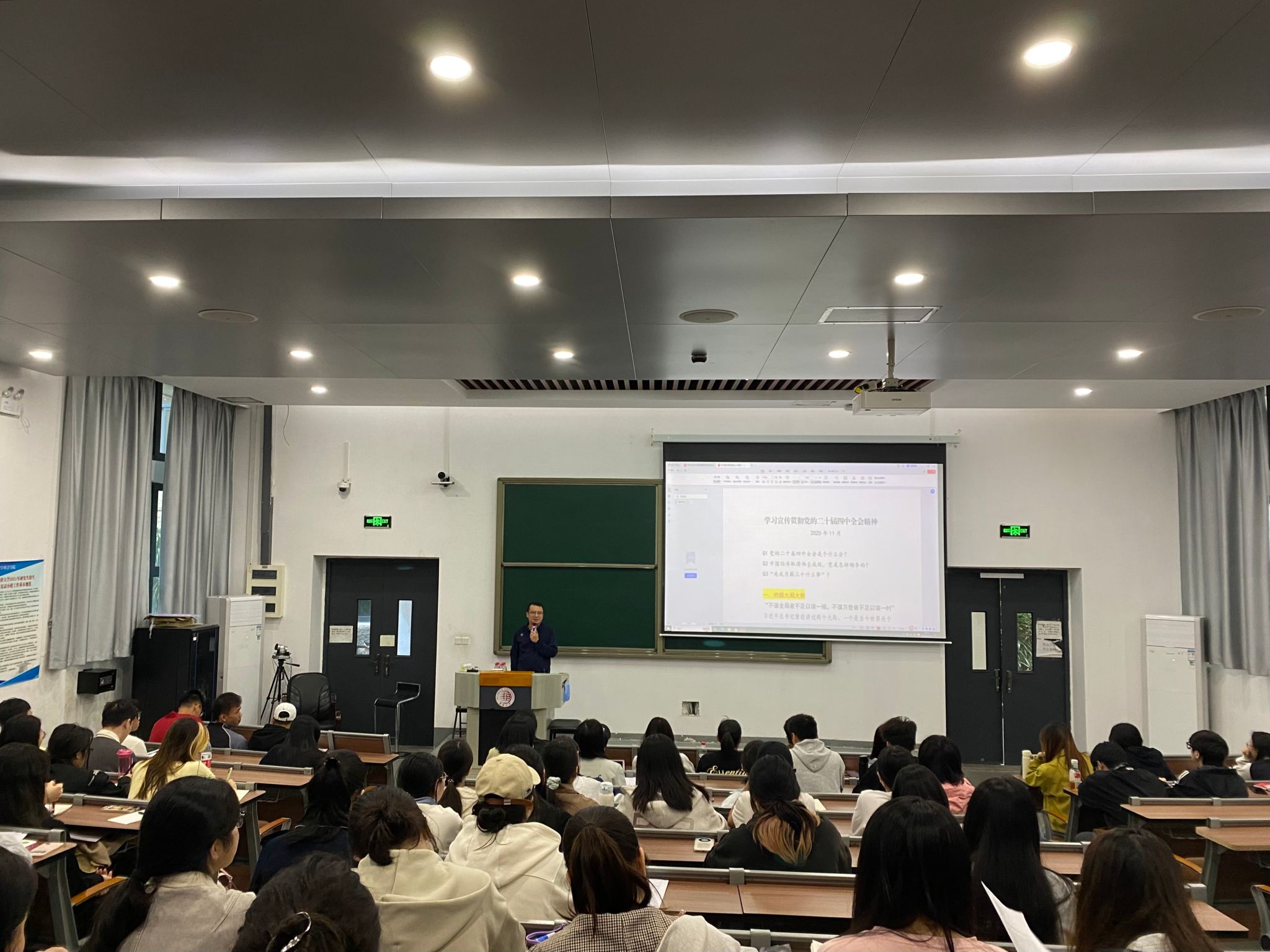 党委宣传部理论教育科科长康贤章老师紧扣党的二十届四中全会精神展开专题宣讲,他结合习近平总书记在党的二十届四中全会上的重要讲话和《中共中央关于制定国民经济和社会发展第十五个五年规划的建议》精神,深入阐释了全会的重大意义,系统解读了“十五五”时期在基本实现社会主义现代化进程中的重要地位,经济社会发展的指导方针、主要目标、战略任务与重大举措,借助优秀校友事例,激励学员们将理论学习内化于心、外化于行。