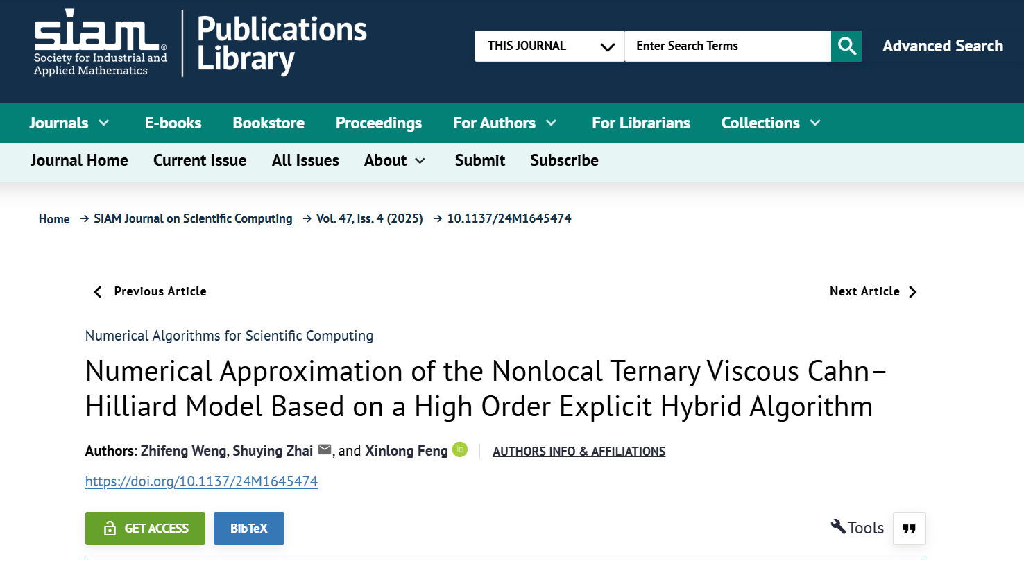 近期,我院青年教师翁智峰与合作者在国际顶尖计算数学期刊《SIAM Journal on Scientific Computing》上发表了题为“Numerical approximation of the nonlocal ternary viscous Cahn-Hilliard model based on a high order explicit hybrid algorithm”的研究论文。该论文主要与翟术英教授、新疆大学冯新龙教授共同合作完成。