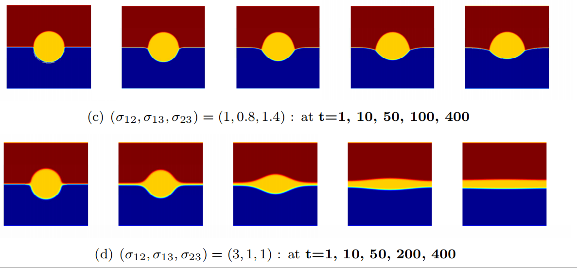 非局部三元粘性Cahn–Hilliard模型是模拟材料微观结构演变的有效模型之一,主要应用于晶体生长、材料组织演变、薄膜和纳米结构生长动力学、 复合材料研发等。该论文主要研究非局部三元粘性Cahn–Hilliard模型,由于引入了有限范围的空间非局部相互作用,对于捕捉块体相间的锐利界面及准确计算接触角至关重要,能够统一涵盖多种流行的相分离模型。目前对该模型动态行为的对比研究匮乏,且针对其复杂的非局部特性开发高精度、稳定且高效的数值方案极具挑战性。论文提出了高效求解非局部相场模型的整体最优算子分裂方法,避免了非线性迭代并实现了空间高精度,建立了算子分裂方法稳定性、收敛性分析一般框架。数值实验表明通过调整界面张量参数,探究三相点处不同相界面之间的夹角变化,进而确定合金的最优组合浓度。这项工作不仅证实了非局部模型在计算接触角方面优于局部及分数阶版本,其揭示的粘弹性蠕变现象更为设计高强度柔性复合材料提供了重要参考,同时该算法也可拓展应用于更复杂的对流问题。
