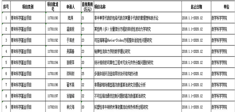 8月17日接校科研院通知,从国家自然科学基金委获悉,截至目前,2017年度数学学院共有9个项目获国家自然科学基金项目立项资助,具体如下: