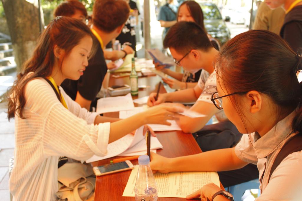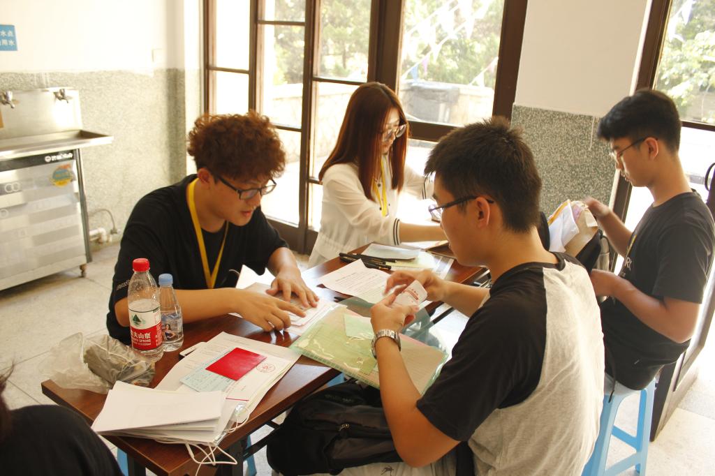 上午八点,新生们开始从各处慢慢聚集起来。首先新生们在学长学姐们的引导下填写家校联系卡并回收存银根,领取军训服装领取单,缴费单据等手续,然后一个个有青春活力的新生沿着“成长之路”走向数院,这“成长之路”记录着每个新生从小学到大学对数学的探索历程,数院也将伴随他们走完这条路。