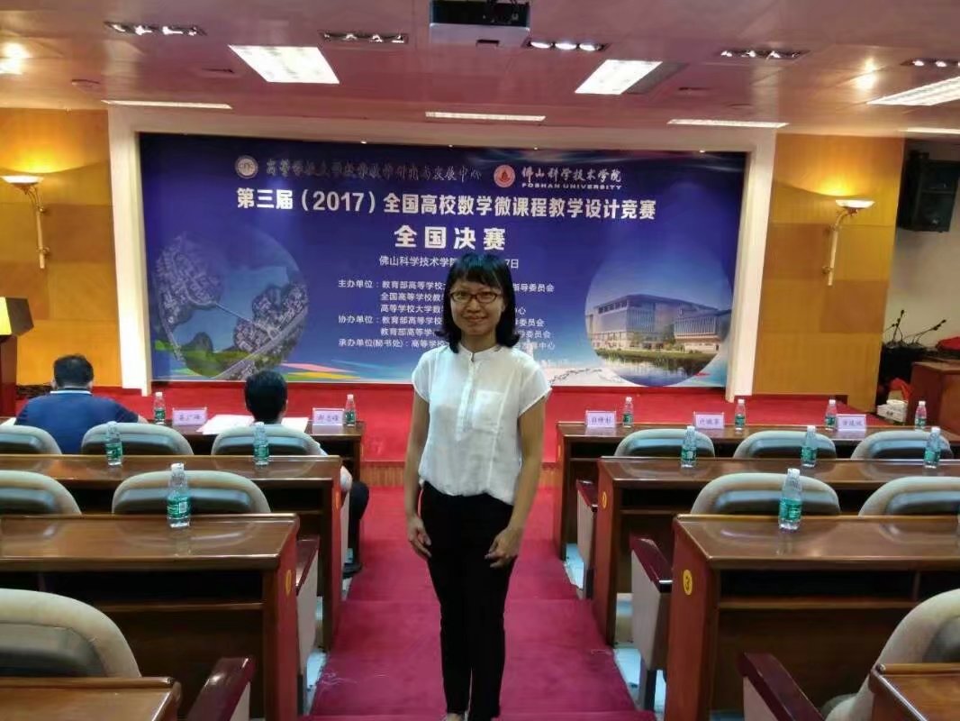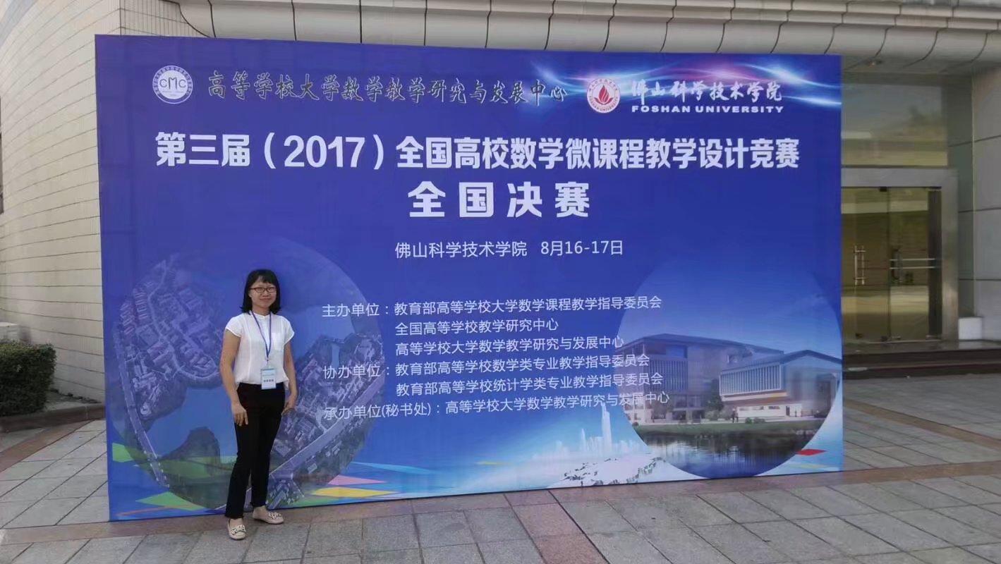 2017年8月16-17日,第三届(2017)全国高校数学微课程教学设计竞赛决赛在广州佛山科学技术学院举行,决赛由教育部高等学校大学数学课程教学指导委员会、全国高等学校研究中心以及高等学校大学数学教学研究与发展中心主办,教育部高等学校数学类专业教学指导委员会、教育部高等学校统计学类专业教学指导委员会协办,高等学校大学数学教学研究与发展中心承办,教育现场会评会议按参赛作品的内容分高等数学、线性代数、概率论与数理统计、大学数学应用案例组进行。经专家组打分评审及全国组委会委员会评,共评选出全国一等奖31名,二等奖19名。我院教师谢小贤最终获得了全国二等奖的好成绩。