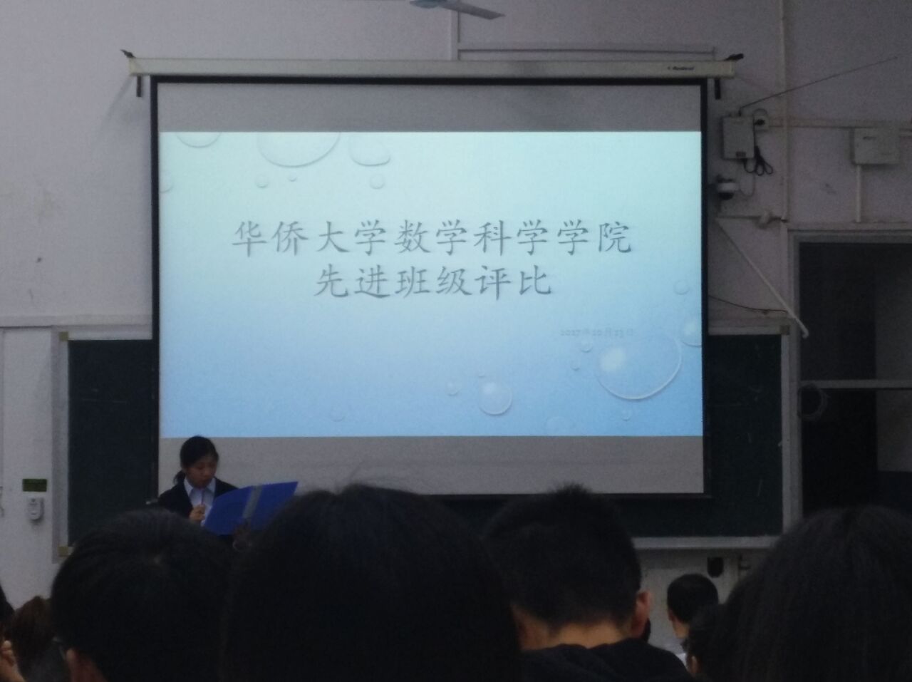 本次评选一共有四个班级,分别是15级信计,15级应数,16级信计,16级应数,此外学院还特别邀请了14级的两位学长学姐分享他们的经验,还有部分17级新生在场观看。评选以现场展示的形式,各班通过各具特色的PPT,展示了积极向上的思想建设、健康优良的班风建设、勤奋严谨的学风建设,活力四射的17级新生也给比赛增添了热烈氛围。通过现场展示,我们看到了各班一年以来的成长,从陌生松散到团结一致,从心无所向到满怀壮志。特别是15级信计班的介绍,用歌曲的形式,展现了班级在一年中的成长和独特的故事,把现场的气氛带到一个高潮,让台下的学弟学妹羡慕不已。短短的15分钟,每个班级都充分地展示了自己的特色,包括政治思想觉悟,学风建设,文体活动,社区建设等。各个环节惊喜不断。