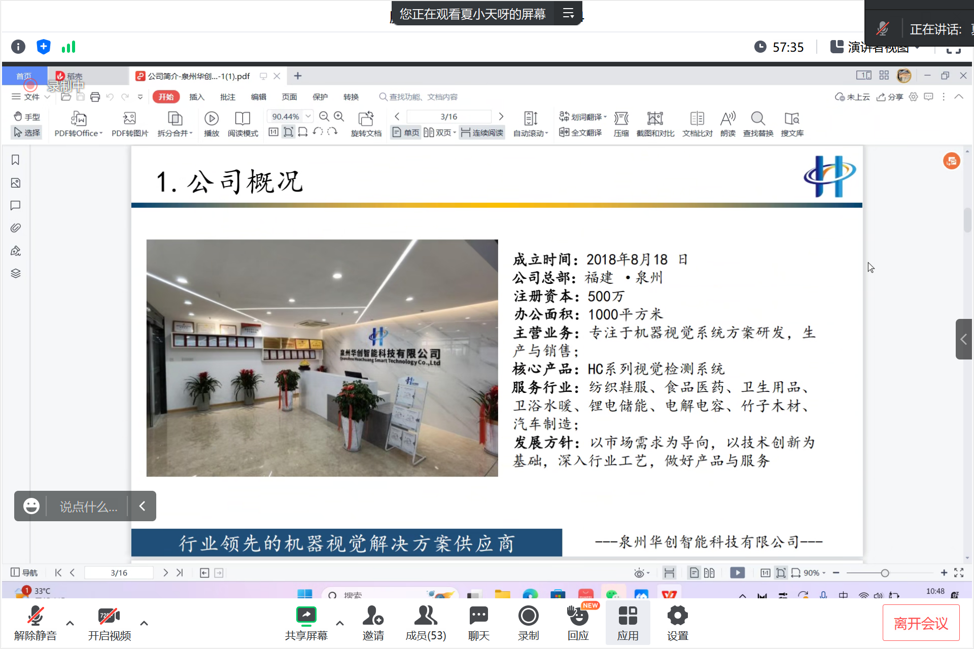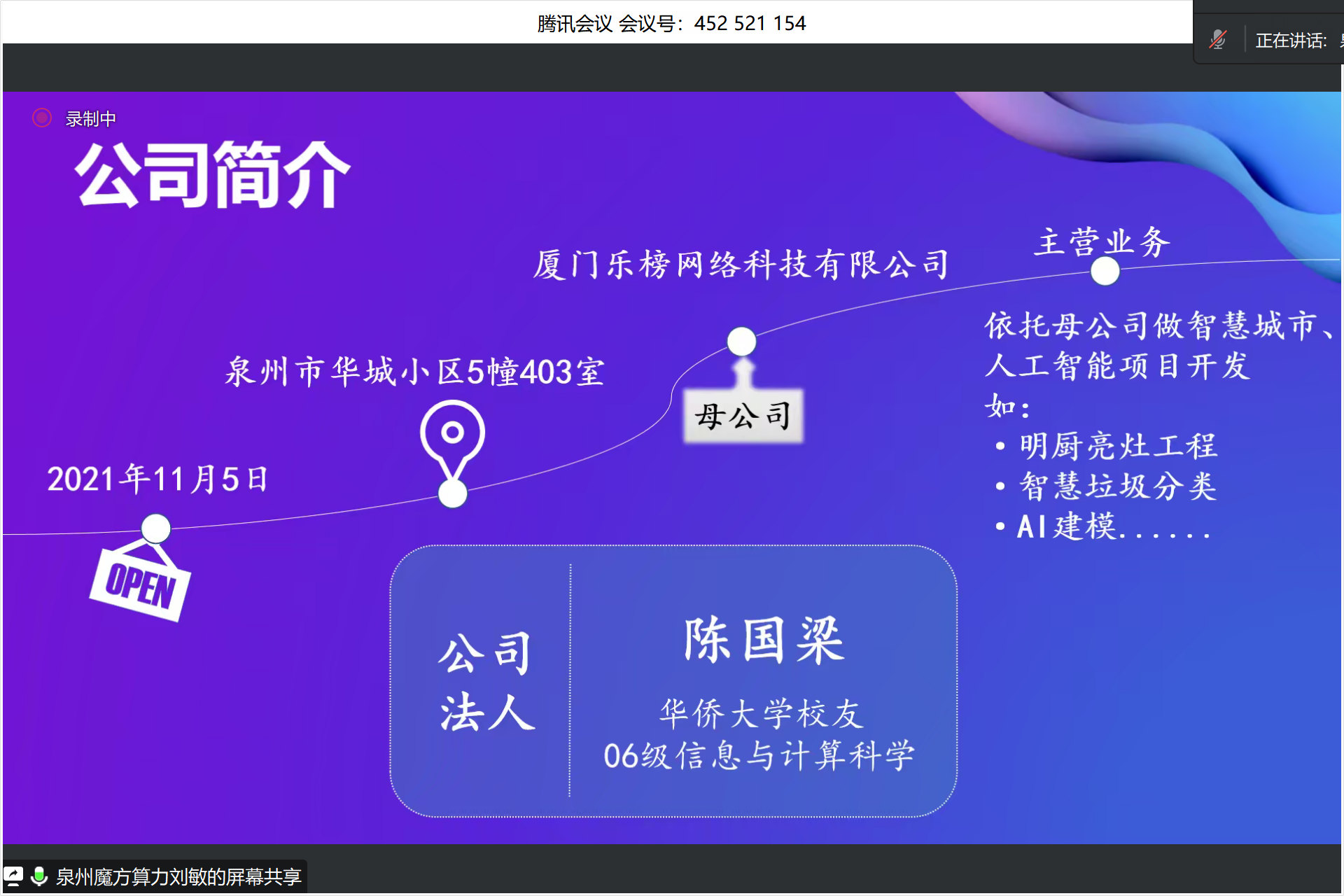 招商银行泉州分行带来的分享会。HR林经理从三个关键词对企业进行了介绍,其中第三个关键词——文化,体现了10万员工的底层共识。企业成立18年,有17个网点,员工平均年龄34岁。再介绍了企业的三个支柱,其中支柱2是“一横一纵”发展体系、支柱3是待遇体系。再从实习生训练营的招聘生源情况、内容安排、成效展示、招聘岗位、如何加入进行介绍,最后的校园招聘从招聘岗位、如何加入进行介绍。此后,校友企业泉州算力魔方公司和华创智能有限公司也分别进行了宣讲招聘。