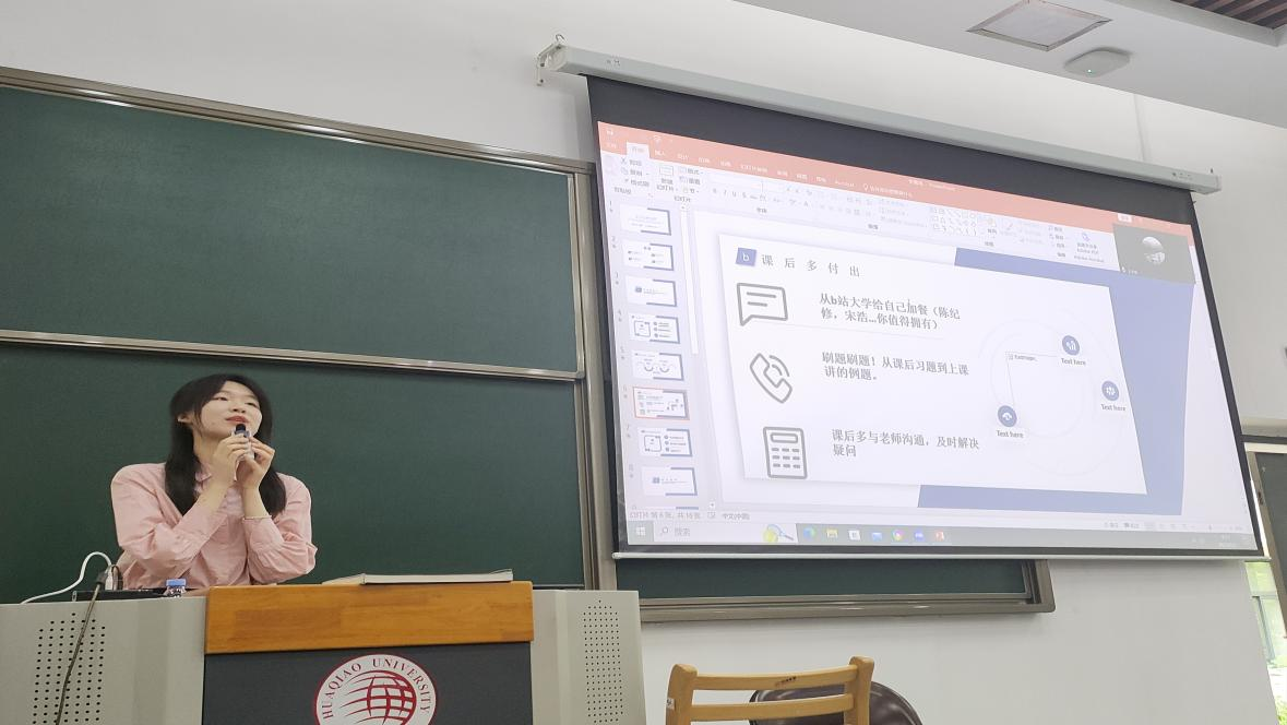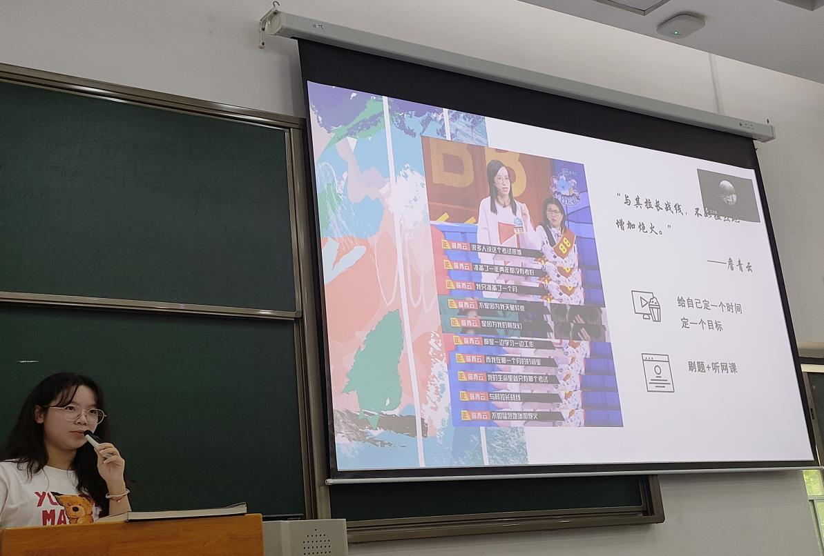 2021级优秀学生忻路瑶针对于专业课学习,如何提高绩点,如何学懂专业课,以及竞赛科研方向对同学们进行指引。从自己学习道路中遇到的困难以及学习技巧进行分享,有助于同学们在成绩上进行提升。忻路瑶同学根据自己参加的竞赛和科研经验以及学习心态对大家进行分享,同学们在此次分享中收获颇多。
