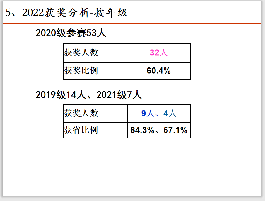 他就我院去年的参赛成绩进行了全方位的总结。总结发现队长为我院学生的参赛队的获奖率57.14%;我院所有参赛学生的获奖率为60%,其中2019级学生获奖率高出平均值4个百分点。