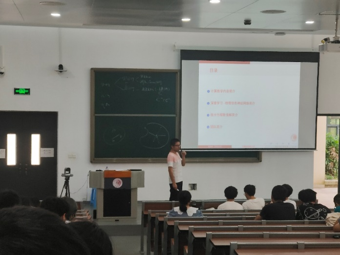首先,他细心的介绍了计算数学的发展历程、计算数学的具体应用以及我国计算数学取得的重大成果。其次,展示了物理信息神经网络求解微分方程的理论成就,言语之间句句振奋。最后,介绍了团队中的核心成员、团队的主要研究方式、团队的取得的核心成果、主讲课程、指导学员等等内容。至此,翁智峰老师的介绍结束。