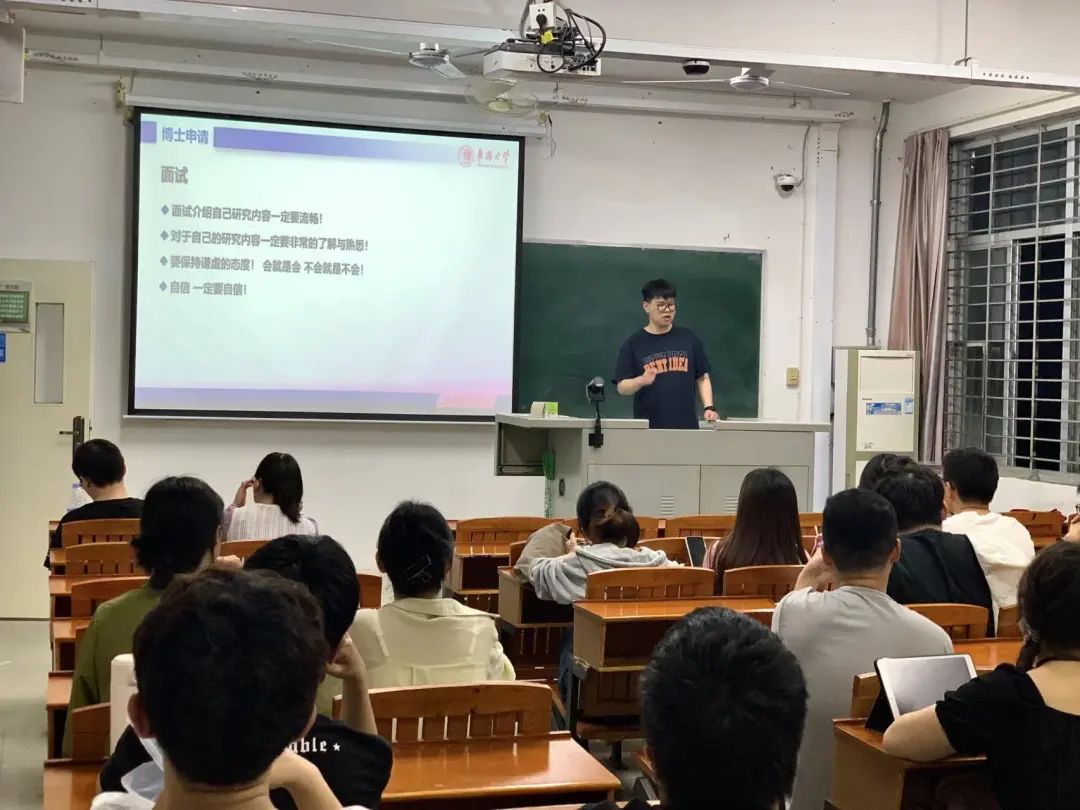 首先,成功申请到东南大学博士的伍勇刚同学为大家详细解析了申博的关键时间点、博导选择的重要性、博士申请的整体流程、博士待遇以及毕业后的相关事宜,他特别强调,在面试过程中,必须对自己的研究内容了如指掌,与导师们的沟通应自信而谦逊,遇到不熟悉的问题时,应坦诚回答,避免过度紧张。随后,考入中山大学博士的利叶斌同学详细介绍了博士研究生的报名流程、材料准备要点、研究计划书的撰写技巧以及面试中的应对策略,强调了信息收集的重要性,建议大家多渠道获取博士招聘的信息,并精准掌握自己的竞争状况。紧接着,申请到UMASS博士的郭先超同学则着重分享了他申请国外博士的经验,他建议大家首先要明确自己的读博意愿,然后及时搜集资料并规划时间线,还为大家详细列举了申请国外博士所需准备的材料清单。