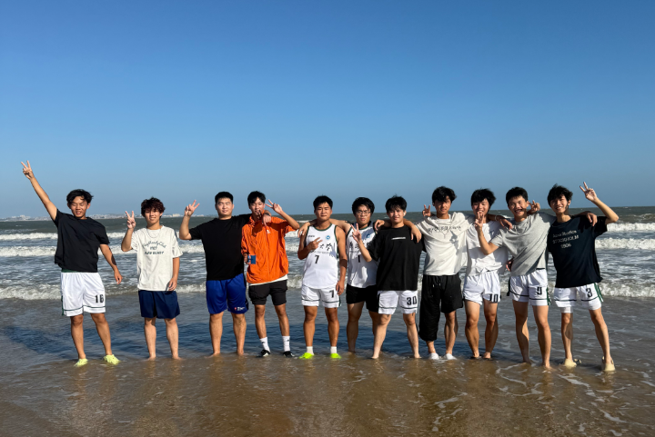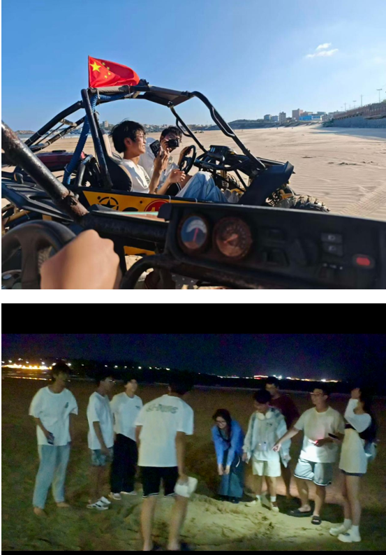金色的沙滩便成了自由嬉戏的乐园。同学们仿佛回到了纯真的童年,有的三五成群,追逐着涌上沙滩的浪花,在浅浅的海水中留下串串欢快的脚印;有的则发挥创意,协作堆砌起宏伟的沙堡,将天马行空的想象化为现实的艺术品;更有同学即兴开展了小型沙滩车赛,灵动的身影在夕阳下划出充满活力的轨迹。欢声笑语随着海风飘向远方,所有初识的拘谨在这一刻被彻底打破。这片海滩,不仅承载了游戏的乐趣,更成为了新生们快速拉近距离、释放真我天性的最佳舞台。