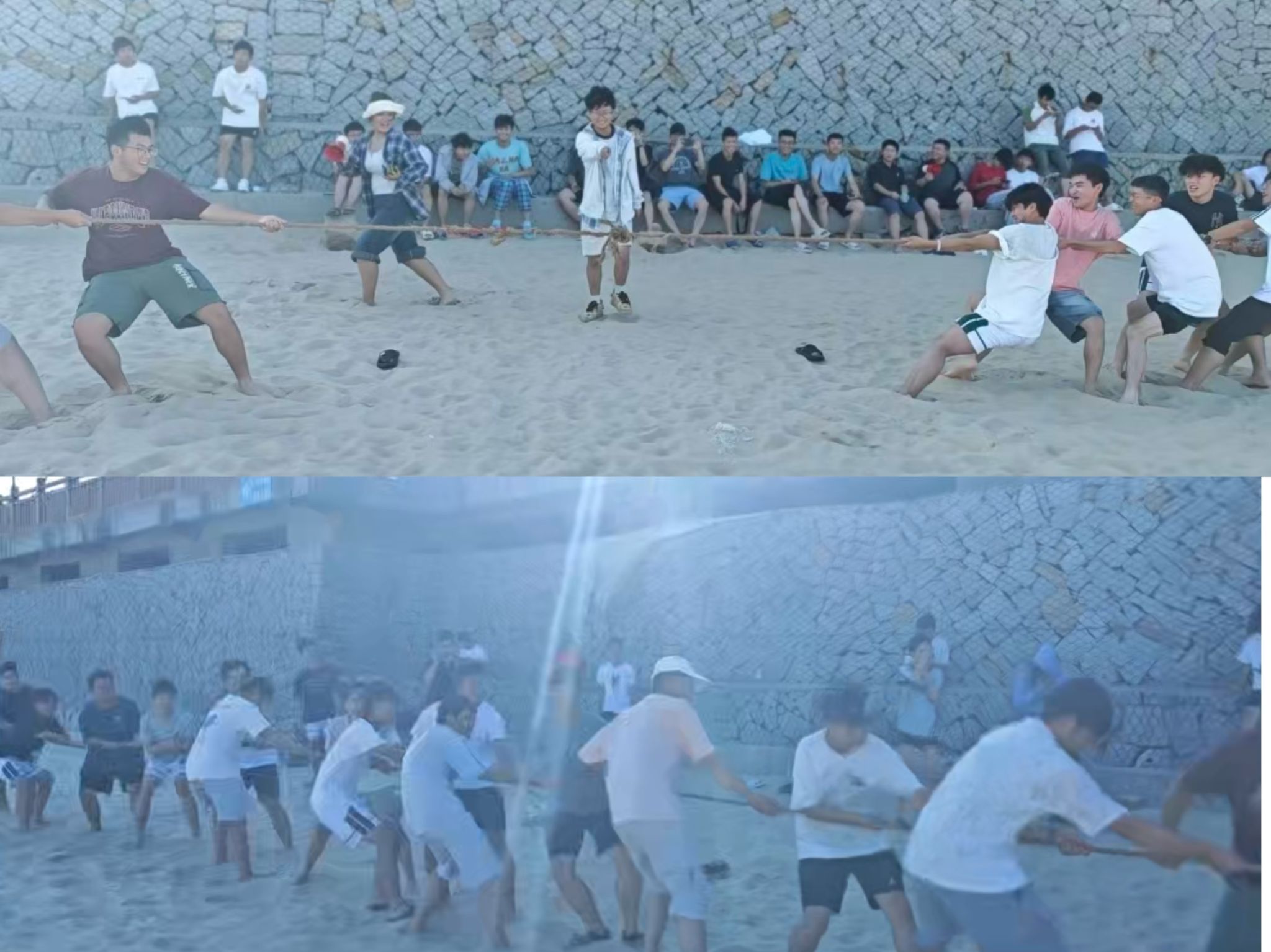 傍晚的月亮湾,落日熔金,为蔚蓝的海面披上璀璨的霓裳。平日里与公式定理为伴的数院学子们,此刻化身为沙滩上最富活力的风景线。活动在极具挑战性与趣味性的拔河比赛中拉开高潮。