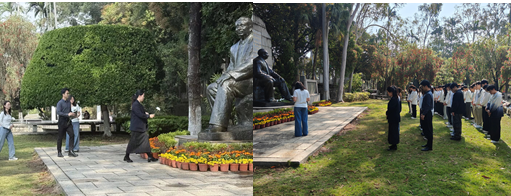 学院师生上前,在廖承志先生铜像前敬献鲜花,全体人员肃立行注目礼,以芬芳的鲜花传递对先辈的无限敬仰与深切追思。献花仪式后,全体人员面向铜像肃立,低头默哀一分钟,在静默中缅怀廖公的崇高品格与历史功绩,感悟先辈初心,汲取前行力量。