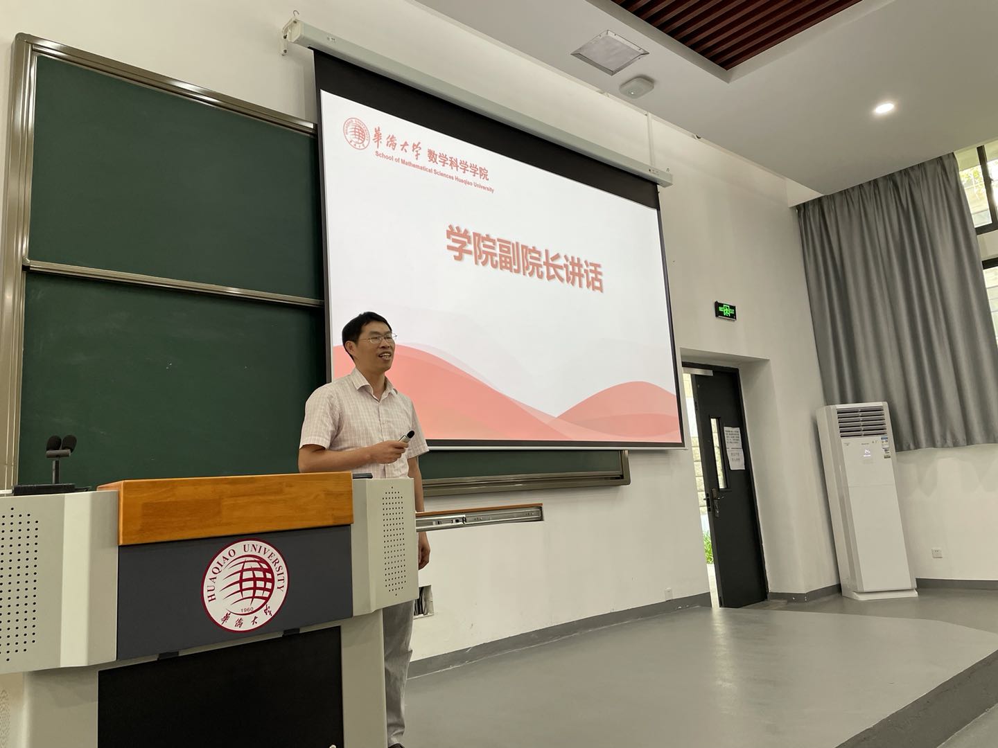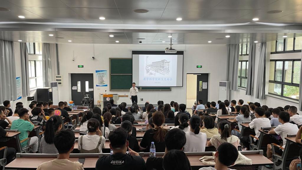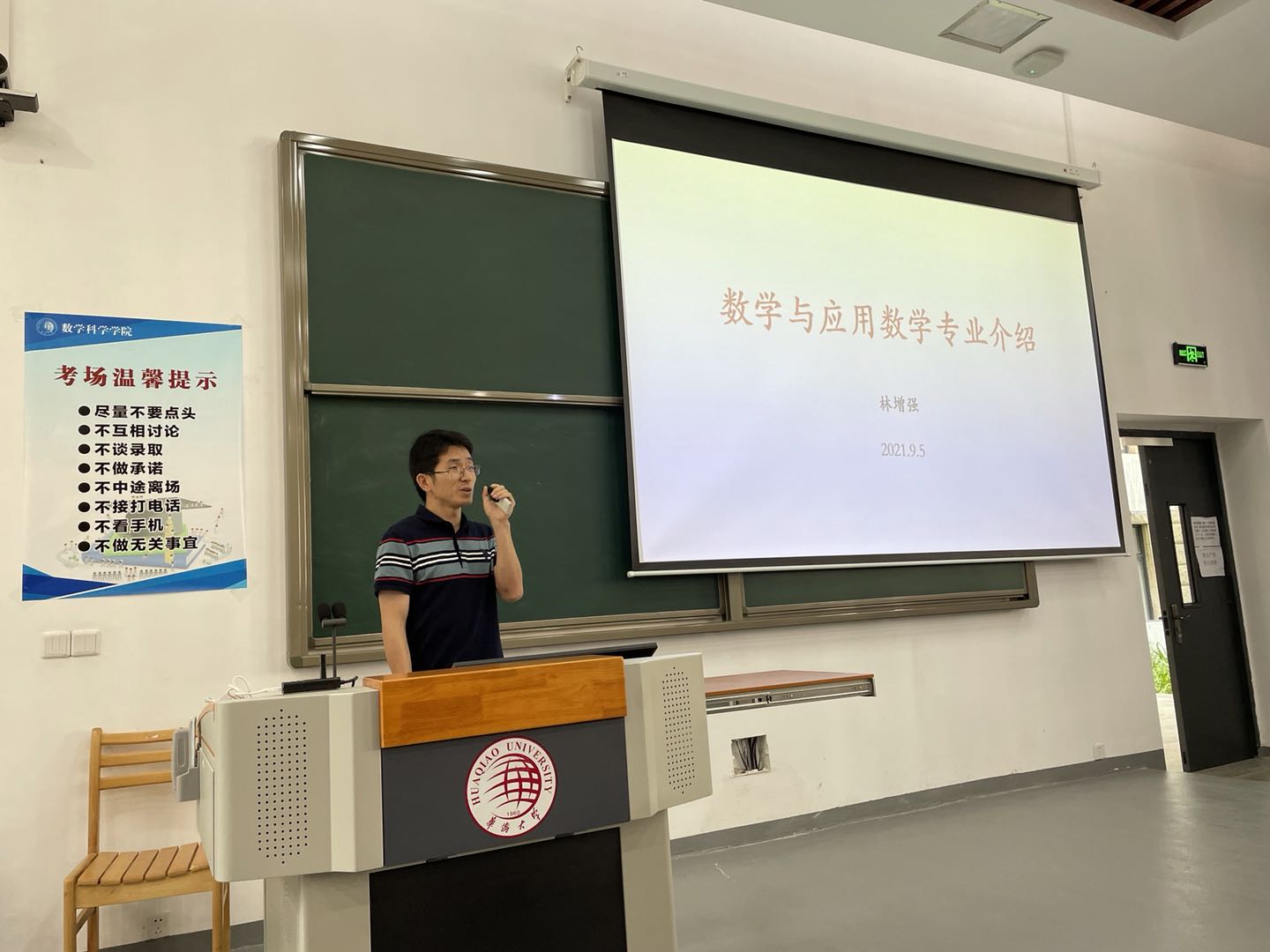 陈行堤鼓励新生在科研征途中独立思考、克服困难、探求真理、完善自我的快乐和幸福,在肩负时代重任时行胜于言,在攀登知识高峰中追求卓越,勇做学术研究的前锋。汤龙坤解读了教学管理相关政策和规定,对专业培养目标、学分、绩点等毕业要求进行详细说明。他勉励2021级的新生们努力成为心境纯洁、思维睿智、自强不息、追求卓越的数学学子。林增强从学科专业上进行介绍,希望新生们热爱数学,热爱研究,努力成为一流的知识和人才。