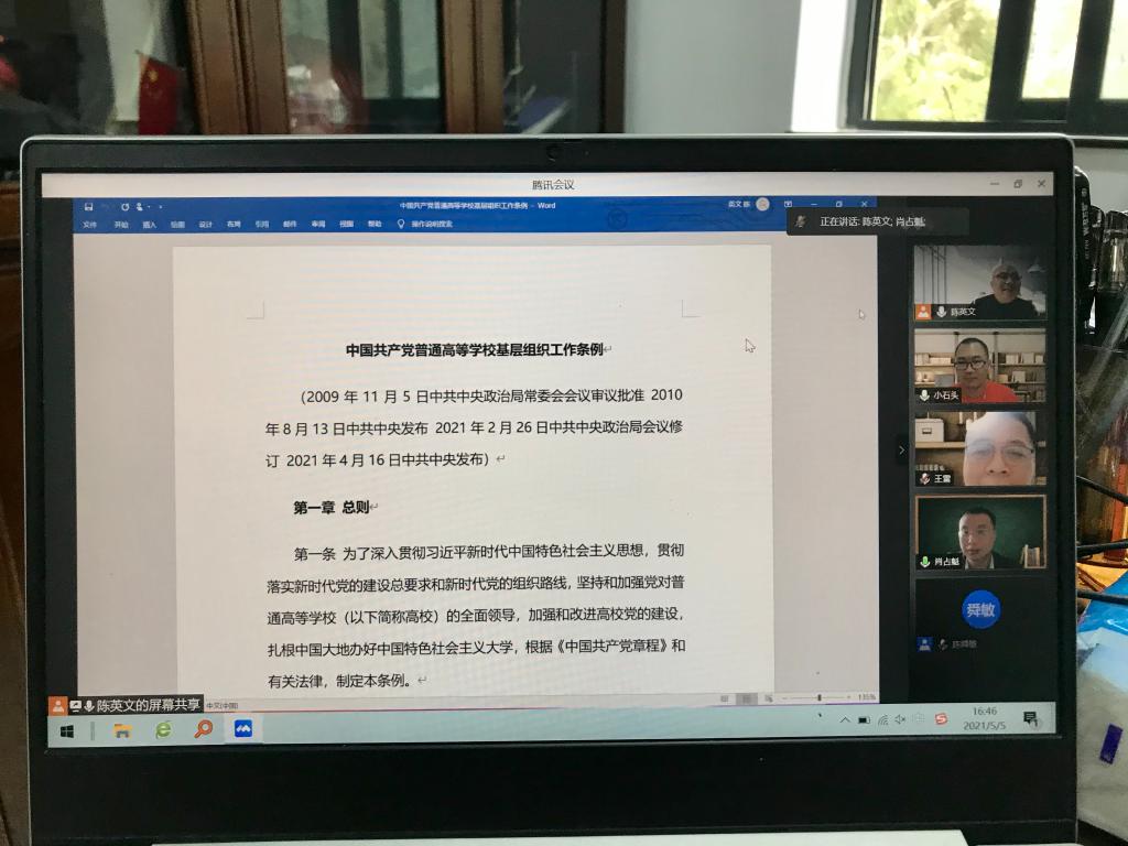 陈英文强调,学院党委将结合党史学习教育,进一步认真组织学习、贯彻《条例》精神,全面掌握《条例》内容,严格遵守和执行《条例》规定,全面加强党的建设,坚守为党育人、为国育才,推动学院各项事业发展更上一个新的台阶。