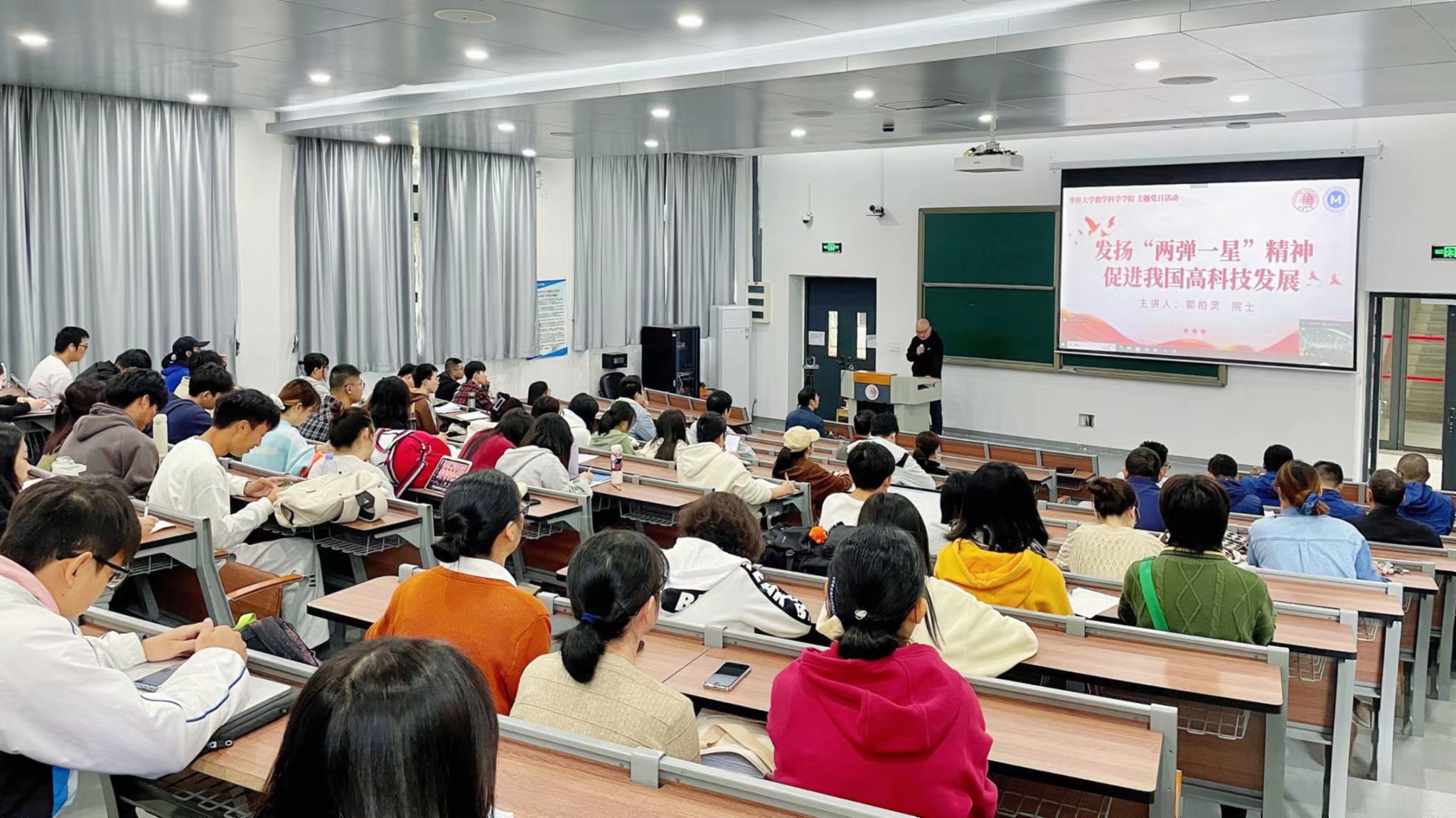 郭柏灵围绕我国“两弹一星”事业的发展史,介绍了我国核武器的研制背景、发展历程及“两弹一星”事业取得重大突破的成功经验。他结合自身参与“两弹”研究的经历,向师生们讲述了上世纪五六十年代,人们发扬“热爱祖国、无私奉献,自力更生、艰苦奋斗,大力协同、勇于登攀”的“两弹一星”精神,走出一条中国特色科技创新道路的奋斗历史事迹。他勉励同学们努力学习、尽展才智,在各行各业中发光发热,为强国事业再立新功,书写无愧于时代的壮丽篇章。