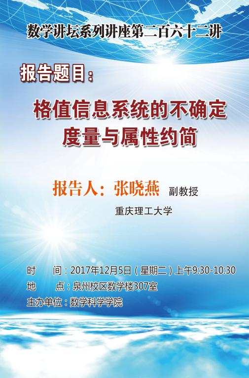 上一条:复杂信息系统知识发现的粒计算方法---重庆理工大学徐伟华教授 下一条:Classification and recursion operators of dark Burgers equation----宁波大学李彪教授