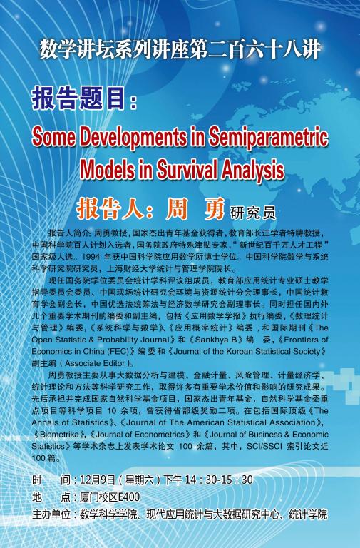 上一条:Testing of missing mechanism with nonresponse using sufficient dimension reduction----西南财经大学陈雪蓉副教授 下一条:On several Peakon, Toda lattices and the associated spectral problems---中国科学院数学与系统科学研究院常向科副研究员
