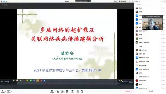 12月17-19日,由福建省生物数学学会主办,yl23411永利集团承办的2021年福建省生物数学学会年圆满完成。由于受疫情影响,本次年会采用云端会议的形式,来自武汉大学、加拿大York大学、华东师范大学、天津工业大学、厦门大学、福州大学、福建师范大学和福建农林大学等20余所院校的100多位专家出席了会议。我院副院长陈行堤教授担任开幕仪式主持人。